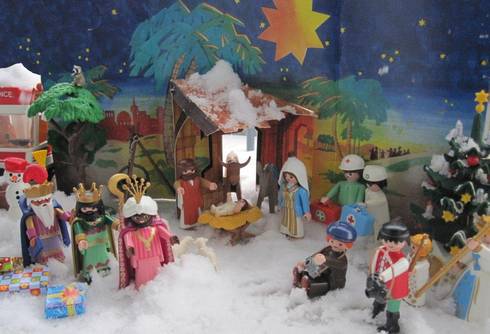 Jedes Jahr am Heiligabend stelle ich die alte Playmobil-Krippe meiner Kinder auf dem Fensterbrett auf. Maria in einem goldblauen Kleid und weißem Kopftuch, Josef in seiner Zimmermannskluft und zwischen ihnen eine kleine Krippe mit dem Baby. Ohne Windeln, mit Plastikstroh. Und sie sind alle dabei: die drei Weisen aus dem Morgenland mit Geschenken im Weihnachtspapier verpackt, Touristen mit Fotoapparaten, eine Ärztin und eine Hebamme mit Arztkoffern und einem Krankenwagen. Zwei Engel ganz in der Ecke und sogar ein Schneemann.